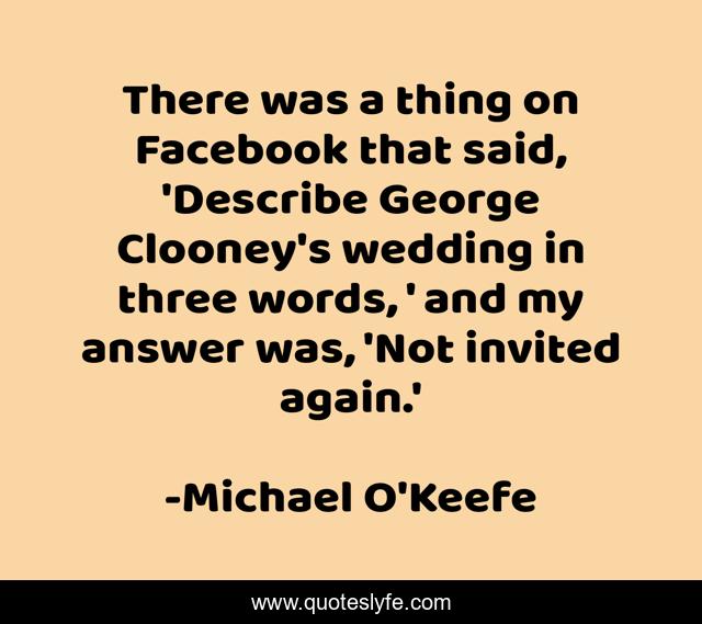 This page presents the quote "There was a thing on Facebook that said, 'Describe George Clooney's wedding in three words, ' and my answer was, 'Not invited again.'". Author of this quote is Michael O'Keefe. This quote is about said, three, words,.