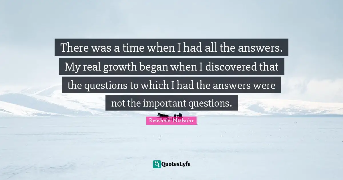 This page presents the quote "There was a time when I had all the answers. My real growth began when I discovered that the questions to which I had the answers were not the important questions.". Author of this quote is Reinhold Niebuhr. This quote is about important, time, answers, real, important questions, growth,.