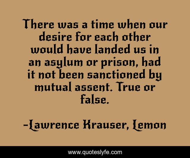 This page presents the quote "There was a time when our desire for each other would have landed us in an asylum or prison, had it not been sanctioned by mutual assent. True or false.". Author of this quote is Lawrence Krauser, Lemon. This quote is about romance, unrequited-love, stalking,.