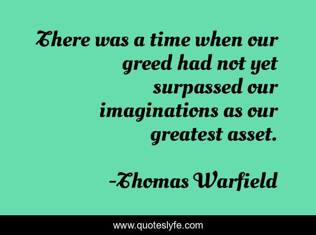 This page presents the quote "There was a time when our greed had not yet surpassed our imaginations as our greatest asset.". Author of this quote is Thomas Warfield. This quote is about imagination, greed,.