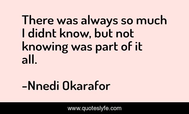 This page presents the quote "There was always so much I didnt know, but not knowing was part of it all.". Author of this quote is Nnedi Okarafor. This quote is about self-love, growing-up,.