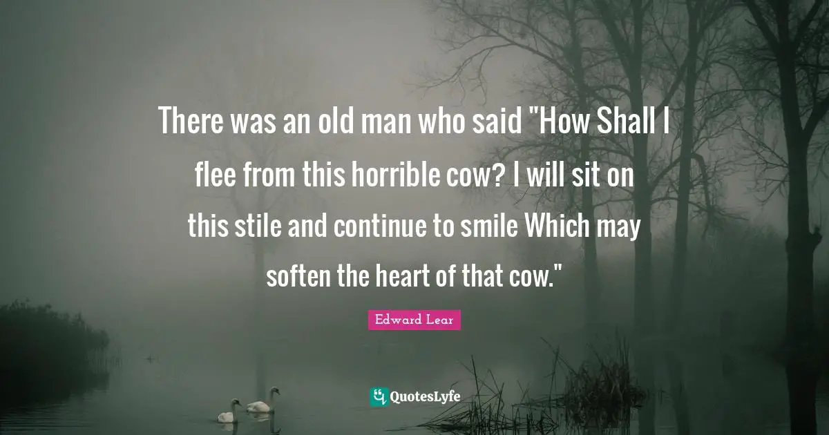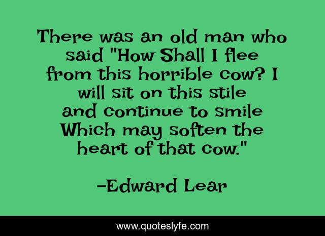 This page presents the quote "There was an old man who said "How Shall I flee from this horrible cow? I will sit on this stile and continue to smile Which may soften the heart of that cow."". Author of this quote is Edward Lear. .