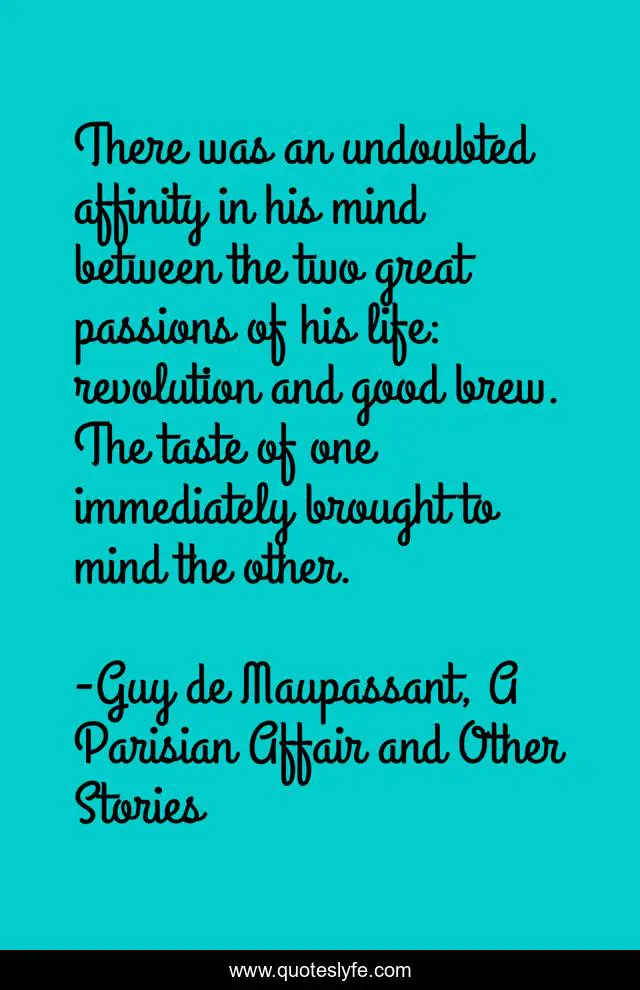 This page presents the quote "There was an undoubted affinity in his mind between the two great passions of his life: revolution and good brew. The taste of one immediately brought to mind the other.". Author of this quote is Guy de Maupassant, A Parisian Affair and Other Stories. This quote is about beer, revolution, boule-de-suif,.