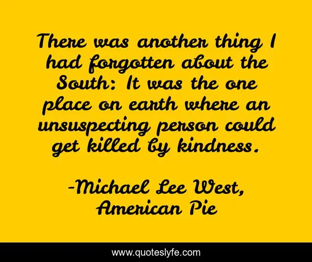 This page presents the quote "There was another thing I had forgotten about the South: It was the one place on earth where an unsuspecting person could get killed by kindness.". Author of this quote is Michael Lee West, American Pie. This quote is about kindness, south,.