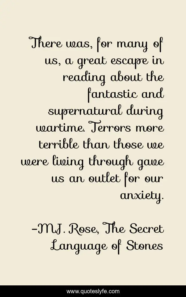 This page presents the quote "There was, for many of us, a great escape in reading about the fantastic and supernatural during wartime. Terrors more terrible than those we were living through gave us an outlet for our anxiety.". Author of this quote is M.J. Rose, The Secret Language of Stones. This quote is about reading-escape, anxiety, war, wartime,.