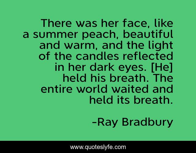 This page presents the quote "There was her face, like a summer peach, beautiful and warm, and the light of the candles reflected in her dark eyes. [He] held his breath. The entire world waited and held its breath.". Author of this quote is Ray Bradbury. This quote is about love, affection, women,.