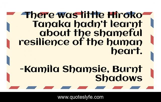 This page presents the quote "There was little Hiroko Tanaka hadn’t learnt about the shameful resilience of the human heart.". Author of this quote is Kamila Shamsie, Burnt Shadows. This quote is about grief, heart, resilience,.
