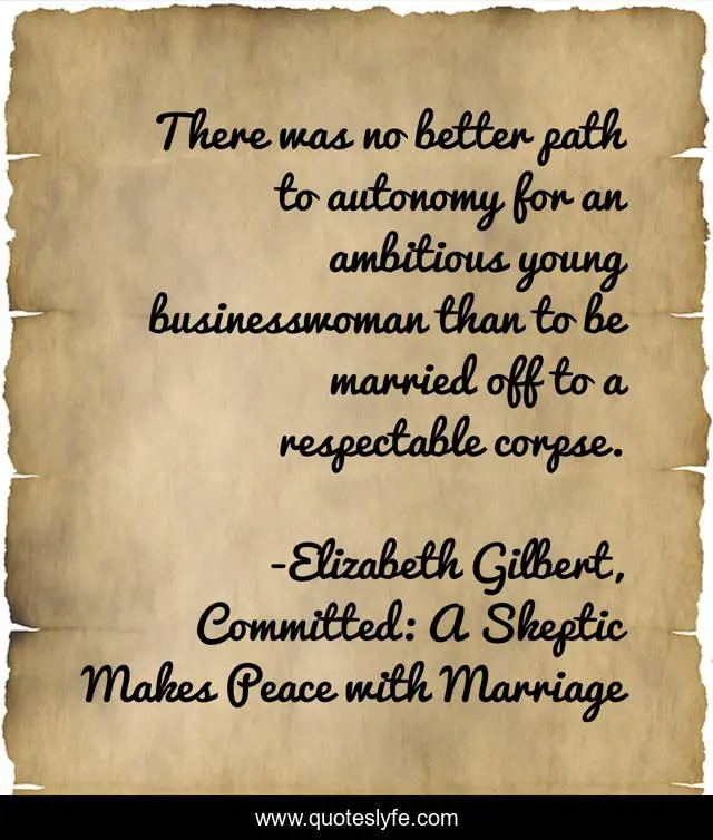 This page presents the quote "There was no better path to autonomy for an ambitious young businesswoman than to be married off to a respectable corpse.". Author of this quote is Elizabeth Gilbert, Committed: A Skeptic Makes Peace with Marriage. This quote is about memoir, elizabeth-gilbert,.