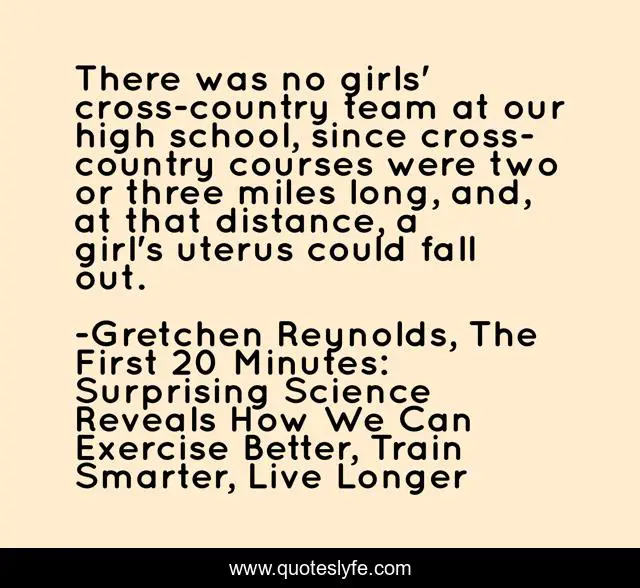 This page presents the quote "There was no girls' cross-country team at our high school, since cross-country courses were two or three miles long, and, at that distance, a girl's uterus could fall out.". Author of this quote is Gretchen Reynolds, The First 20 Minutes: Surprising Science Reveals How We Can Exercise Better, Train Smarter, Live Longer. This quote is about running, girls, exercise,.