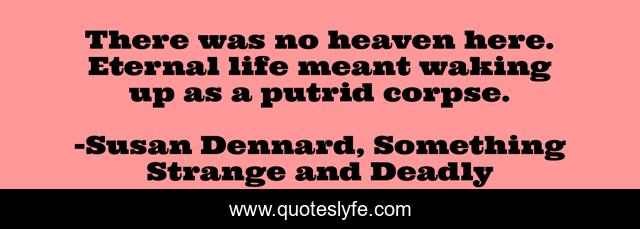 This page presents the quote "There was no heaven here. Eternal life meant waking up as a putrid corpse.". Author of this quote is Susan Dennard, Something Strange and Deadly. This quote is about zombie, death, heaven,.