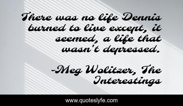 This page presents the quote "There was no life Dennis burned to live except, it seemed, a life that wasn't depressed.". Author of this quote is Meg Wolitzer, The Interestings. This quote is about depressed, life, depression,.