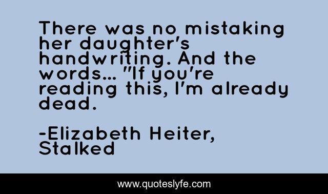 This page presents the quote "There was no mistaking her daughter's handwriting. And the words... "If you're reading this, I'm already dead.". Author of this quote is Elizabeth Heiter, Stalked. This quote is about mystery, psychological-suspense, kidnapping, profiler, family-secrets, suspense, profiler-series, fbi,.