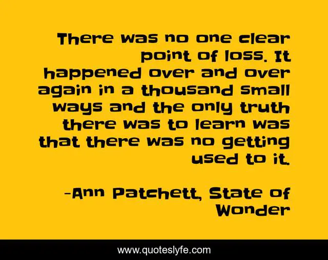 This page presents the quote "There was no one clear point of loss. It happened over and over again in a thousand small ways and the only truth there was to learn was that there was no getting used to it.". Author of this quote is Ann Patchett, State of Wonder. .