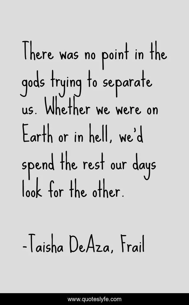 This page presents the quote "There was no point in the gods trying to separate us. Whether we were on Earth or in hell, we'd spend the rest our days look for the other.". Author of this quote is Taisha DeAza, Frail. This quote is about young-adult-fiction, young-adult-romance, young-adult-series, young-adult-fiction-fantasy,.