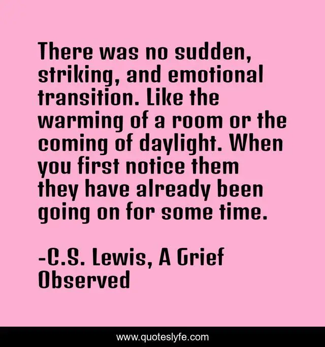 This page presents the quote "There was no sudden, striking, and emotional transition. Like the warming of a room or the coming of daylight. When you first notice them they have already been going on for some time.". Author of this quote is C.S. Lewis, A Grief Observed. This quote is about gains, process, gradual, transition, grief, daylight, healing, light, warming,.