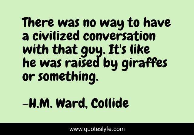 This page presents the quote "There was no way to have a civilized conversation with that guy. It's like he was raised by giraffes or something.". Author of this quote is H.M. Ward, Collide. This quote is about funny, comedy, humor,.