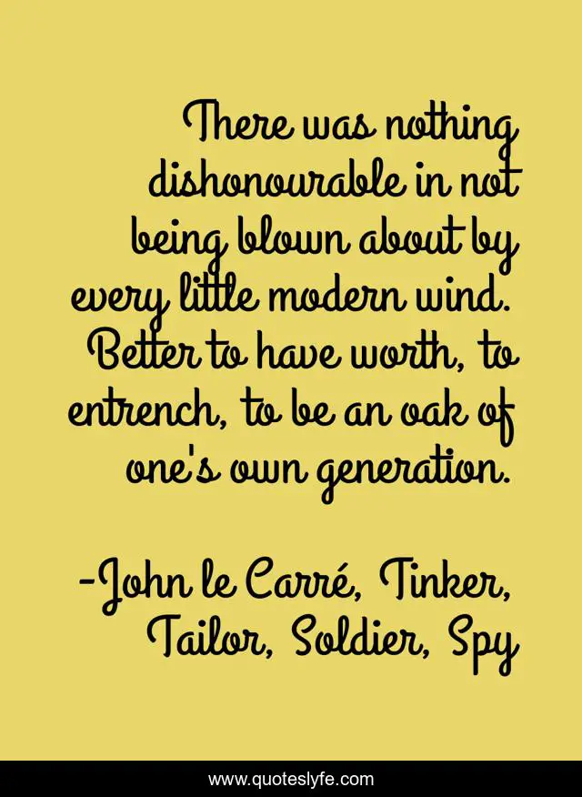 This page presents the quote "There was nothing dishonourable in not being blown about by every little modern wind. Better to have worth, to entrench, to be an oak of one's own generation.". Author of this quote is John le Carré, Tinker, Tailor, Soldier, Spy. .