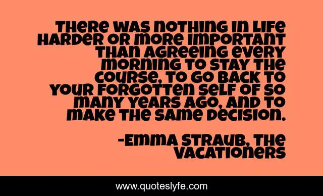 This page presents the quote "There was nothing in life harder or more important than agreeing every morning to stay the course, to go back to your forgotten self of so many years ago, and to make the same decision.". Author of this quote is Emma Straub, The Vacationers. This quote is about relationships, love, commitment, marriage, life-lessons, affection,.