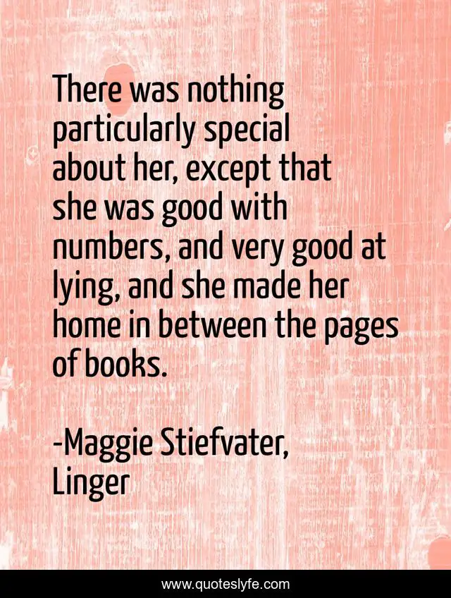 This page presents the quote "There was nothing particularly special about her, except that she was good with numbers, and very good at lying, and she made her home in between the pages of books.". Author of this quote is Maggie Stiefvater, Linger. This quote is about books, grace, linger,.