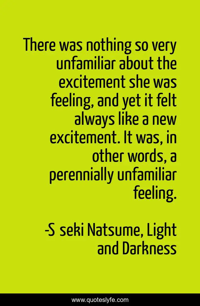 This page presents the quote "There was nothing so very unfamiliar about the excitement she was feeling, and yet it felt always like a new excitement. It was, in other words, a perennially unfamiliar feeling.". Author of this quote is Sōseki Natsume, Light and Darkness. This quote is about excitement, living, feelings,.