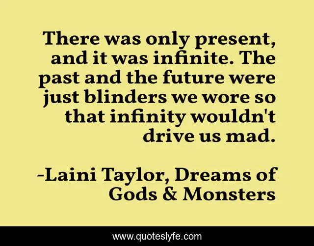 This page presents the quote "There was only present, and it was infinite. The past and the future were just blinders we wore so that infinity wouldn't drive us mad.". Author of this quote is Laini Taylor, Dreams of Gods & Monsters. This quote is about past, future, present, time,.
