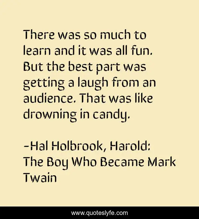 This page presents the quote "There was so much to learn and it was all fun. But the best part was getting a laugh from an audience. That was like drowning in candy.". Author of this quote is Hal Holbrook, Harold: The Boy Who Became Mark Twain. This quote is about appreciation, acting, laughter, applause,.