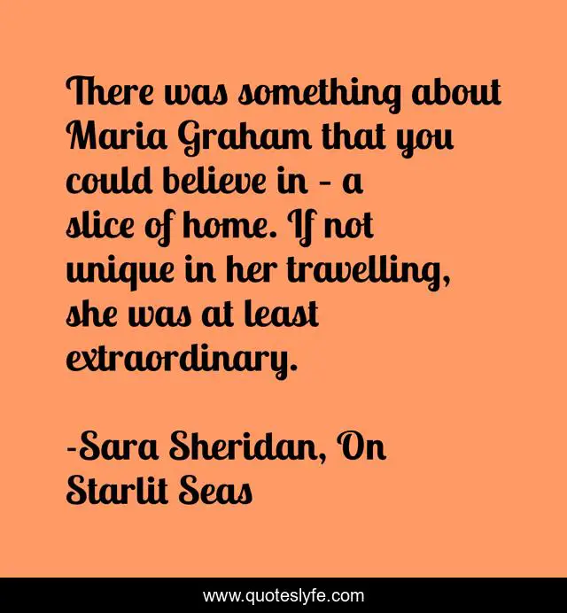 This page presents the quote "There was something about Maria Graham that you could believe in – a slice of home. If not unique in her travelling, she was at least extraordinary.". Author of this quote is Sara Sheridan, On Starlit Seas. This quote is about extraordinary, comfort, female-characters,.