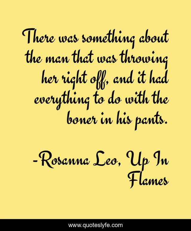 This page presents the quote "There was something about the man that was throwing her right off, and it had everything to do with the boner in his pants.". Author of this quote is Rosanna Leo, Up In Flames. This quote is about erection, man,.