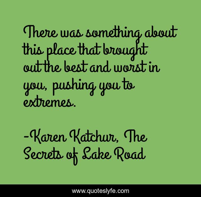 This page presents the quote "There was something about this place that brought out the best and worst in you, pushing you to extremes.". Author of this quote is Karen Katchur, The Secrets of Lake Road. This quote is about mystery, karen-katchur, the-secrets-of-lake-road,.