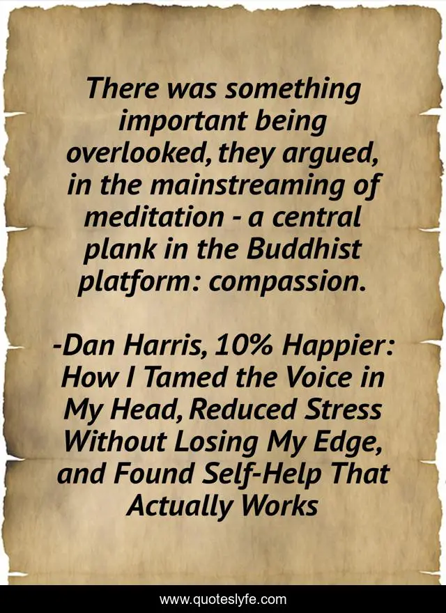This page presents the quote "There was something important being overlooked, they argued, in the mainstreaming of meditation - a central plank in the Buddhist platform: compassion.". Author of this quote is Dan Harris, 10% Happier: How I Tamed the Voice in My Head, Reduced Stress Without Losing My Edge, and Found Self-Help That Actually Works. This quote is about buddhism, meditation,.