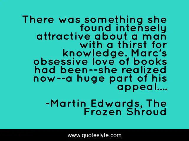 This page presents the quote "There was something she found intensely attractive about a man with a thirst for knowledge. Marc's obsessive love of books had been--she realized now--a huge part of his appeal....". Author of this quote is Martin Edwards, The Frozen Shroud. This quote is about attraction, books, knowledge,.
