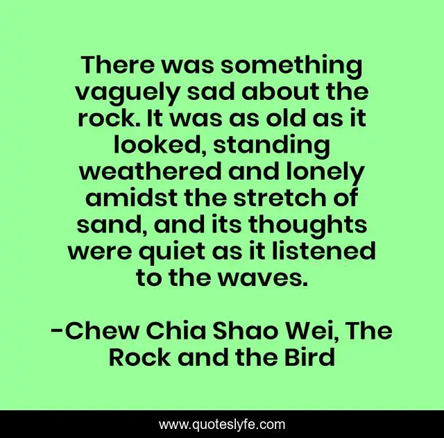 This page presents the quote "There was something vaguely sad about the rock. It was as old as it looked, standing weathered and lonely amidst the stretch of sand, and its thoughts were quiet as it listened to the waves.". Author of this quote is Chew Chia Shao Wei, The Rock and the Bird. This quote is about singapore, sad, germany, short-story, chew-chia-shao-wei, existential, fiction, rock-and-the-bird,.