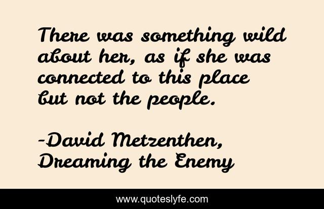 This page presents the quote "There was something wild about her, as if she was connected to this place but not the people.". Author of this quote is David Metzenthen, Dreaming the Enemy. This quote is about wild, war,.