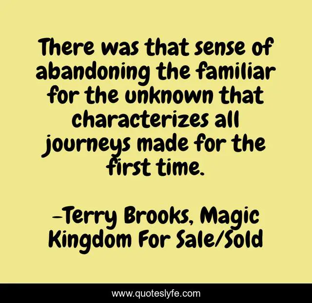 This page presents the quote "There was that sense of abandoning the familiar for the unknown that characterizes all journeys made for the first time.". Author of this quote is Terry Brooks, Magic Kingdom For Sale/Sold. .