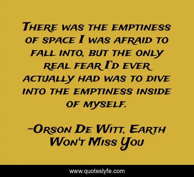This page presents the quote "There was the emptiness of space I was afraid to fall into, but the only real fear I’d ever actually had was to dive into the emptiness inside of myself.". Author of this quote is Orson De Witt, Earth Won't Miss You. This quote is about fear, self-exploration, space,.