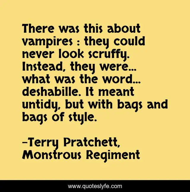 This page presents the quote "There was this about vampires : they could never look scruffy. Instead, they were... what was the word... deshabille. It meant untidy, but with bags and bags of style.". Author of this quote is Terry Pratchett, Monstrous Regiment. This quote is about vampires, humour,.