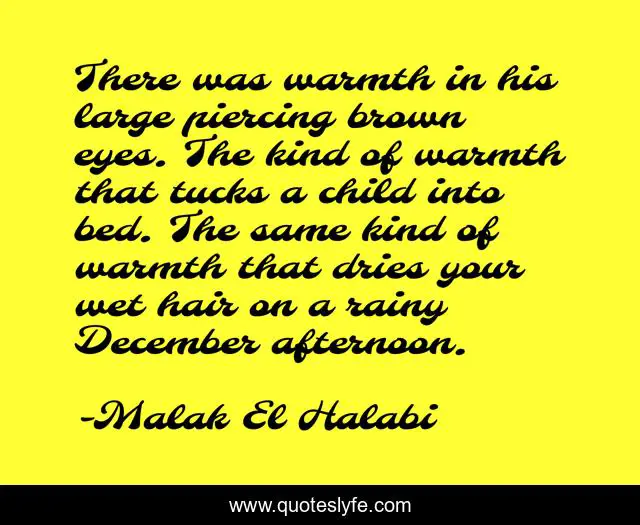 This page presents the quote "There was warmth in his large piercing brown eyes. The kind of warmth that tucks a child into bed. The same kind of warmth that dries your wet hair on a rainy December afternoon.". Author of this quote is Malak El Halabi. This quote is about relationships, eyes, love, december, warmth, affection,.