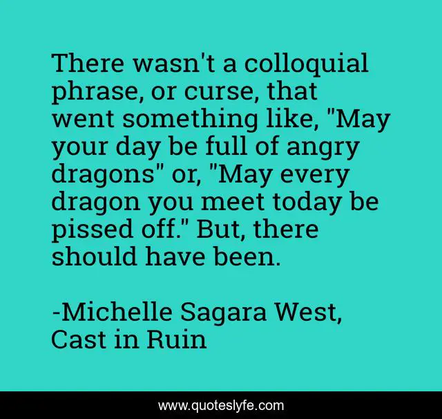 This page presents the quote "There wasn't a colloquial phrase, or curse, that went something like, "May your day be full of angry dragons" or, "May every dragon you meet today be pissed off." But, there should have been.". Author of this quote is Michelle Sagara West, Cast in Ruin. This quote is about fantasy, humor, dragons,.