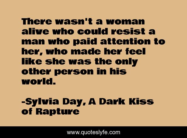 This page presents the quote "There wasn't a woman alive who could resist a man who paid attention to her, who made her feel like she was the only other person in his world.". Author of this quote is Sylvia Day, A Dark Kiss of Rapture. This quote is about woman, dating-advice, relationship, attention, man,.