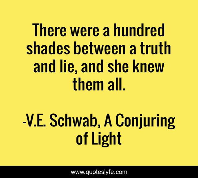 This page presents the quote "There were a hundred shades between a truth and lie, and she knew them all.". Author of this quote is V.E. Schwab, A Conjuring of Light. This quote is about delilah-bard, truth, lies,.