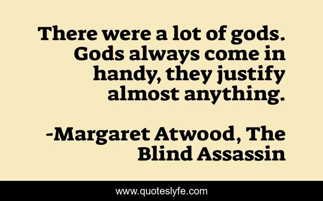 This page presents the quote "There were a lot of gods. Gods always come in handy, they justify almost anything.". Author of this quote is Margaret Atwood, The Blind Assassin. This quote is about justification, dogma, extremism, inhumanity, religion, god, fanaticism,.