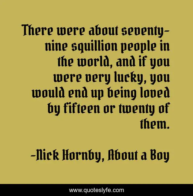This page presents the quote "There were about seventy-nine squillion people in the world, and if you were very lucky, you would end up being loved by fifteen or twenty of them.". Author of this quote is Nick Hornby, About a Boy. This quote is about love, people, lucky, nick-hornby, affection, about-a-boy,.