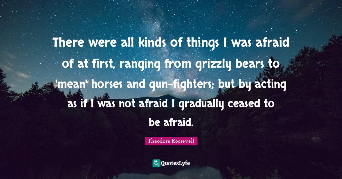 This page presents the quote "There were all kinds of things I was afraid of at first, ranging from grizzly bears to 'mean' horses and gun-fighters; but by acting as if I was not afraid I gradually ceased to be afraid.". Author of this quote is Theodore Roosevelt. This quote is about all kinds, grizzly bears, horse, gun, mean, fear, not afraid, acting as if,.