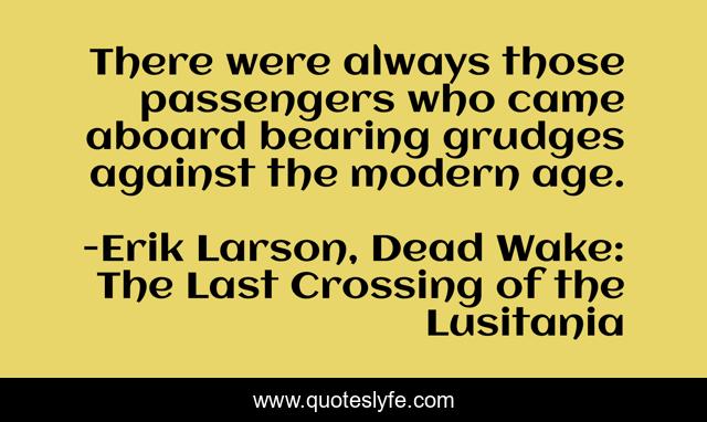 This page presents the quote "There were always those passengers who came aboard bearing grudges against the modern age.". Author of this quote is Erik Larson, Dead Wake: The Last Crossing of the Lusitania. This quote is about culture, technology, nostalgia, perspective,.