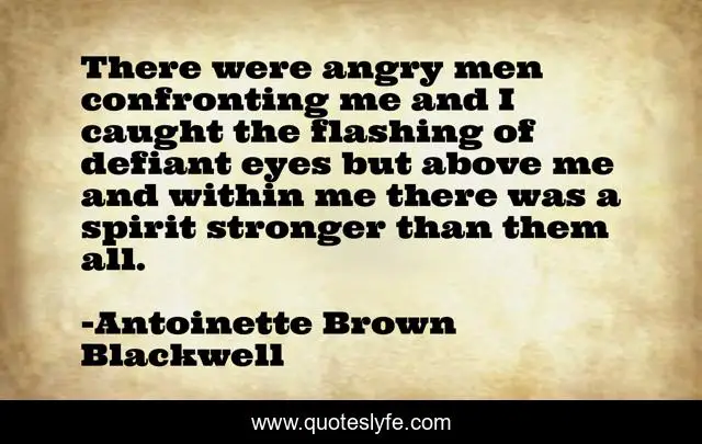 This page presents the quote "There were angry men confronting me and I caught the flashing of defiant eyes but above me and within me there was a spirit stronger than them all.". Author of this quote is Antoinette Brown Blackwell. .