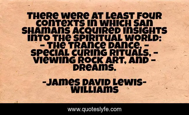 This page presents the quote "There were at least four contexts in which San shamans acquired insights into the spiritual world: – the trance dance, – special curing rituals, – viewing rock art, and – dreams.". Author of this quote is James David Lewis-Williams. This quote is about upper-palaeolithic-art, consciousness,.