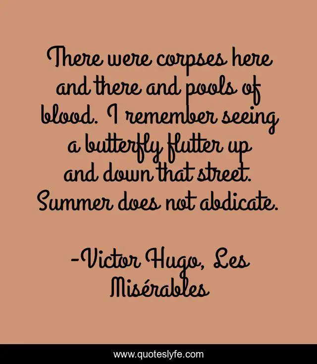 This page presents the quote "There were corpses here and there and pools of blood. I remember seeing a butterfly flutter up and down that street. Summer does not abdicate.". Author of this quote is Victor Hugo, Les Misérables. This quote is about juxtaposition, death, revolution,.