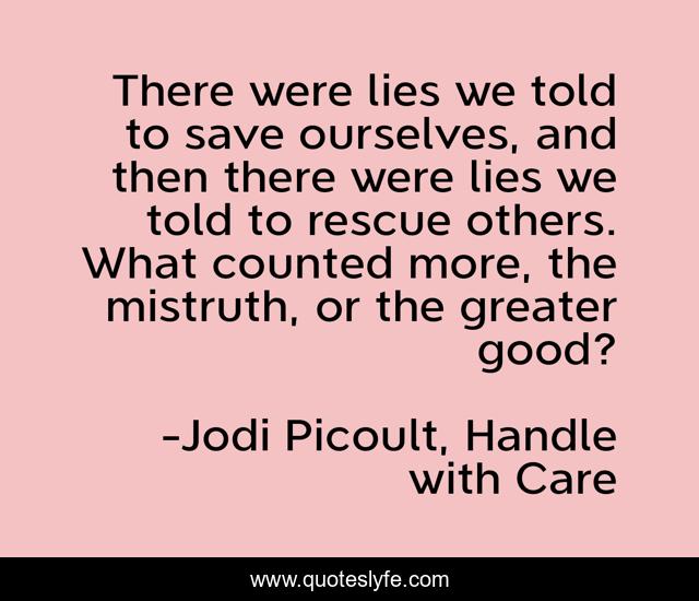This page presents the quote "There were lies we told to save ourselves, and then there were lies we told to rescue others. What counted more, the mistruth, or the greater good?". Author of this quote is Jodi Picoult, Handle with Care. .