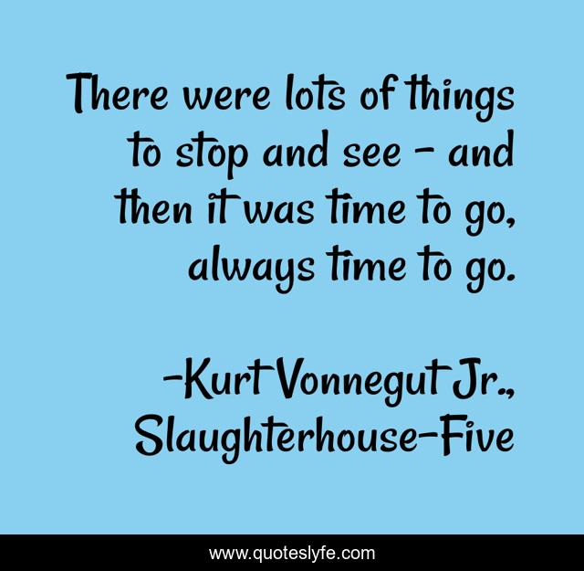 This page presents the quote "There were lots of things to stop and see - and then it was time to go, always time to go.". Author of this quote is Kurt Vonnegut Jr., Slaughterhouse-Five. This quote is about life, travel, traveling,.