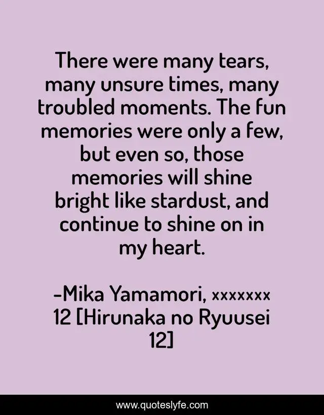 This page presents the quote "There were many tears, many unsure times, many troubled moments. The fun memories were only a few, but even so, those memories will shine bright like stardust, and continue to shine on in my heart.". Author of this quote is Mika Yamamori, ひるなかの流星 12 [Hirunaka no Ryuusei 12]. This quote is about heartache, loss, moving-on,.